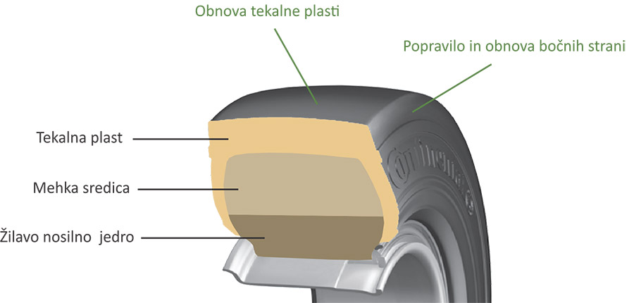 Polne industrijske gume nimajo jeklenih nosilnih jeder in niso polnjene z zrakom. Sestavljene so iz treh različnih delov gume (Slika 1), ki imajo različne lastnosti. Zaradi omenjene zgradbe so idealne za obnavljanje po prvi obrabi. Pri postopku obnove se odstranijo vsi stari deli gume (slika 2) uskladi se pravilna geometrija, pravilni radiji in dimenzije, ki ustrezajo. Nato se nanašajo nove plasti materialov, najprej plast proti oksidaciji nato vezne plasti, ki povežejo osnovni del z novim delom in nazadnje nova tekalna plast , podobno kot pri proizvodnji novih gum.